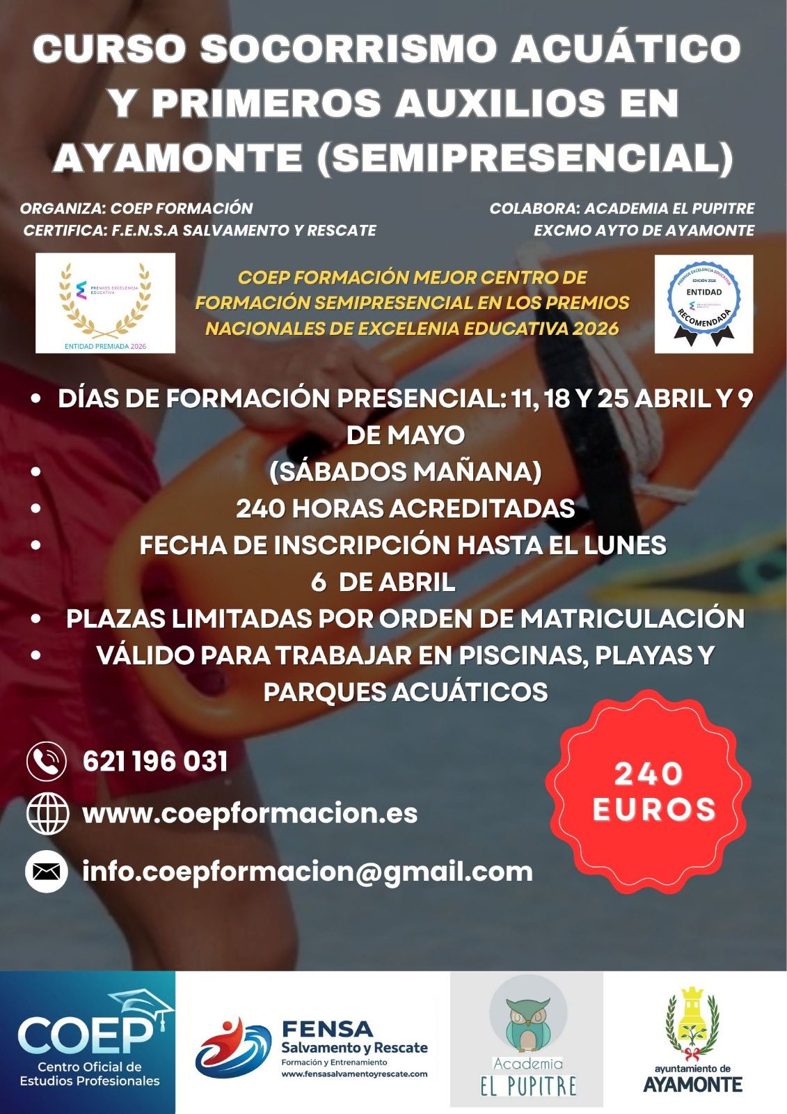 CURSO SOCORRISMO ACUÁTICO Y PRIMEROS AUXILIOS (SEMIPRESENCIAL) + Añadir Google Calendar Exportación + iCal / Outlook 00 días 00 horas 00 minutos 00 segundos Fecha Abr 18 2026 Hora 9:00 am - 6:00 pm Compartir este evento