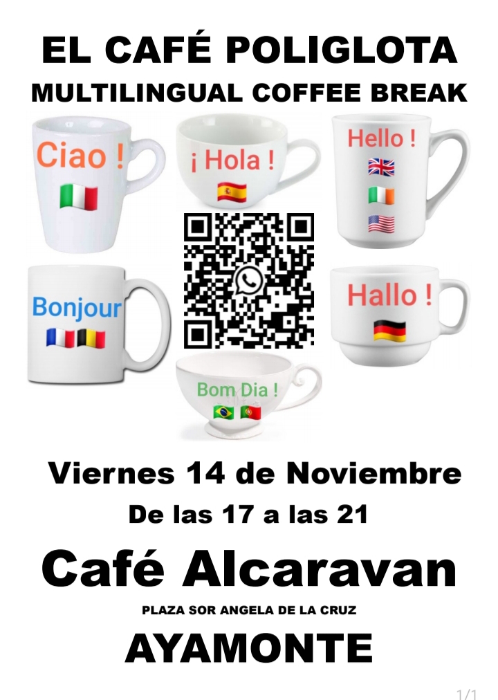 EL CAFÉ POLIGLOTA. MULTILINGUAL COFFEE BREAK + Añadir Google Calendar Exportación + iCal / Outlook 00 días 00 horas 00 minutos 00 segundos Fecha Nov 14 2025 Hora 5:00 pm - 9:00 pm Localización CAFÉ ALCARAVAN Plaza Santa Ángels, C. de José Pérez Barroso, 28. Esquina, 21400 Ayamonte, Huelva Compartir este evento