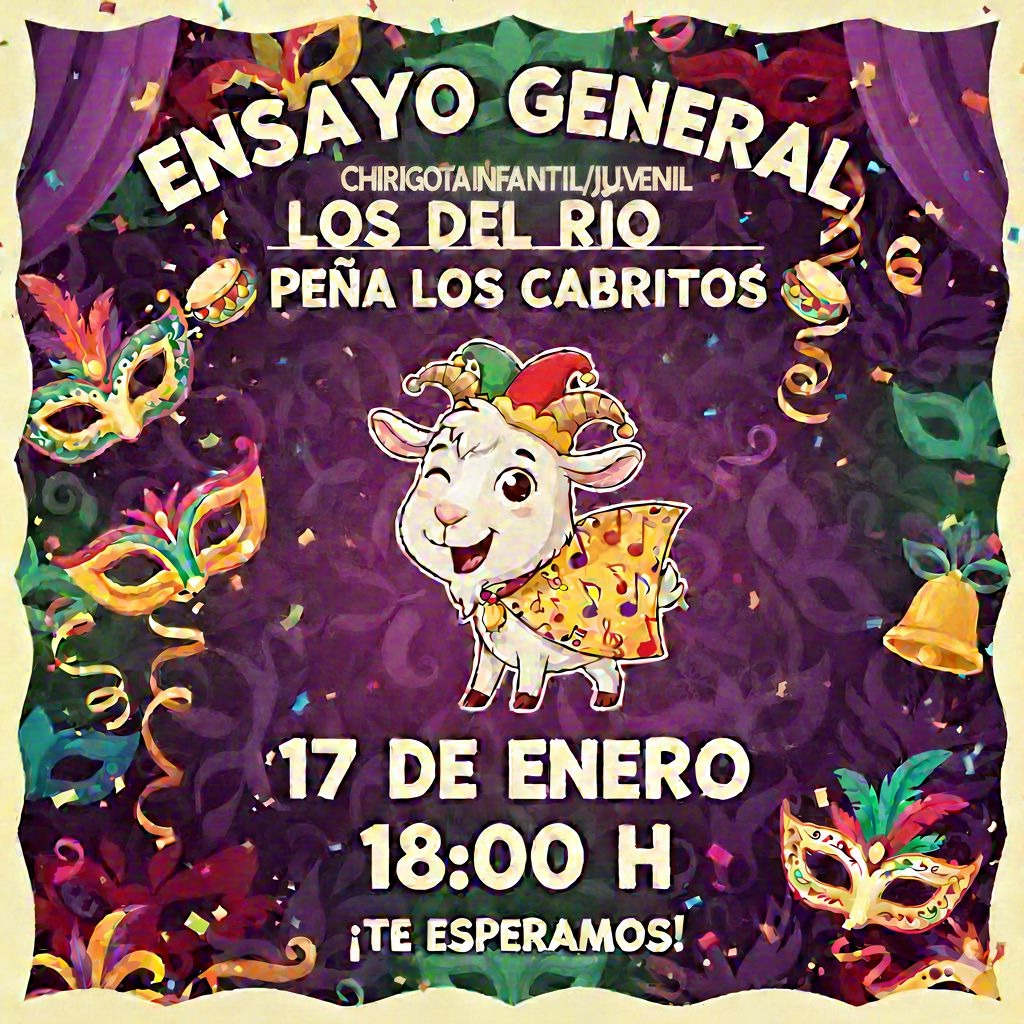 ENSAYO GENERAL CHIRIGOTA INFANTIL/JUVENIL LOS DEL RIO PEÑA LOS CABRITOS + Añadir Google Calendar Exportación + iCal / Outlook El evento está terminado. Fecha Ene 17 2026 Finalizdo! Hora 6:00 pm - 8:00 pm Compartir este evento