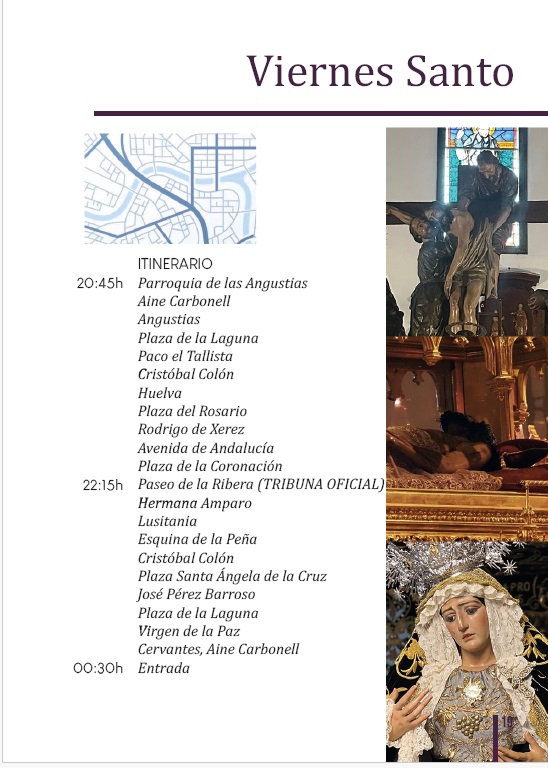 ESTACIÓN PENITENCIA PONTIFICIA, REAL E ILUSTRE HDAD SACRAMENTAL DEL SANTO ENTIERRO, DESCENDIMIENTO CRUZ Y NTRA Sª DEL MAYOR DOLOR + Añadir Google Calendar Exportación + iCal / Outlook 00 días 00 horas 00 minutos 00 segundos Fecha Abr 03 - 04 2026 Hora 8:45 pm - 12:30 am Localización PARROQUIA DE LAS ANGUSTIAS CALLE ANGUSTIAS 8, AYAMONTE Compartir este evento