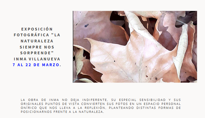 EXPOSICIÓN FOTOGRÁFICA «LA NATURALEZA SIEMPRE NOS SORPRENDE» INMA VILLANUEVA + Añadir Google Calendar Exportación + iCal / Outlook 00 días 00 horas 00 minutos 00 segundos Fecha Mar 07 - 22 2026 Hora 9:30 am - 2:30 pm Localización ECOMUSEO MOLINO MAREAL "EL PINTADO" Salinas del Pintado, 21400 Ayamonte, Huelva Web https://www.bluegreensport.com/ Compartir este evento