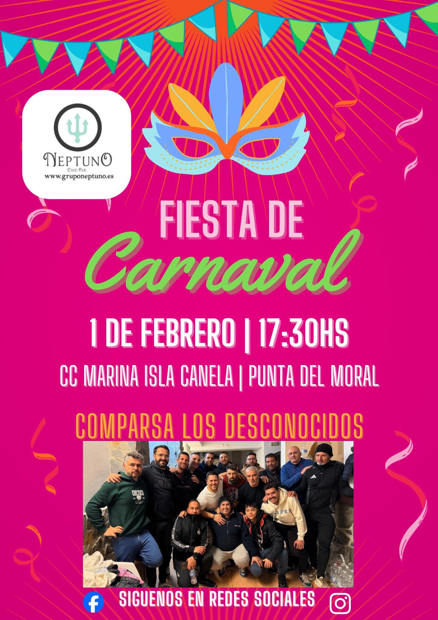 FIESTA DE CARNAVAL. COMPARSA LOS DESCONOCIDOS + Añadir Google Calendar Exportación + iCal / Outlook El evento está terminado. Fecha Feb 01 2026 Finalizdo! Hora 5:30 pm - 7:00 pm Localización PUNTA DEL MORAL PUNTA DEL MORAL, HUELVA Compartir este evento