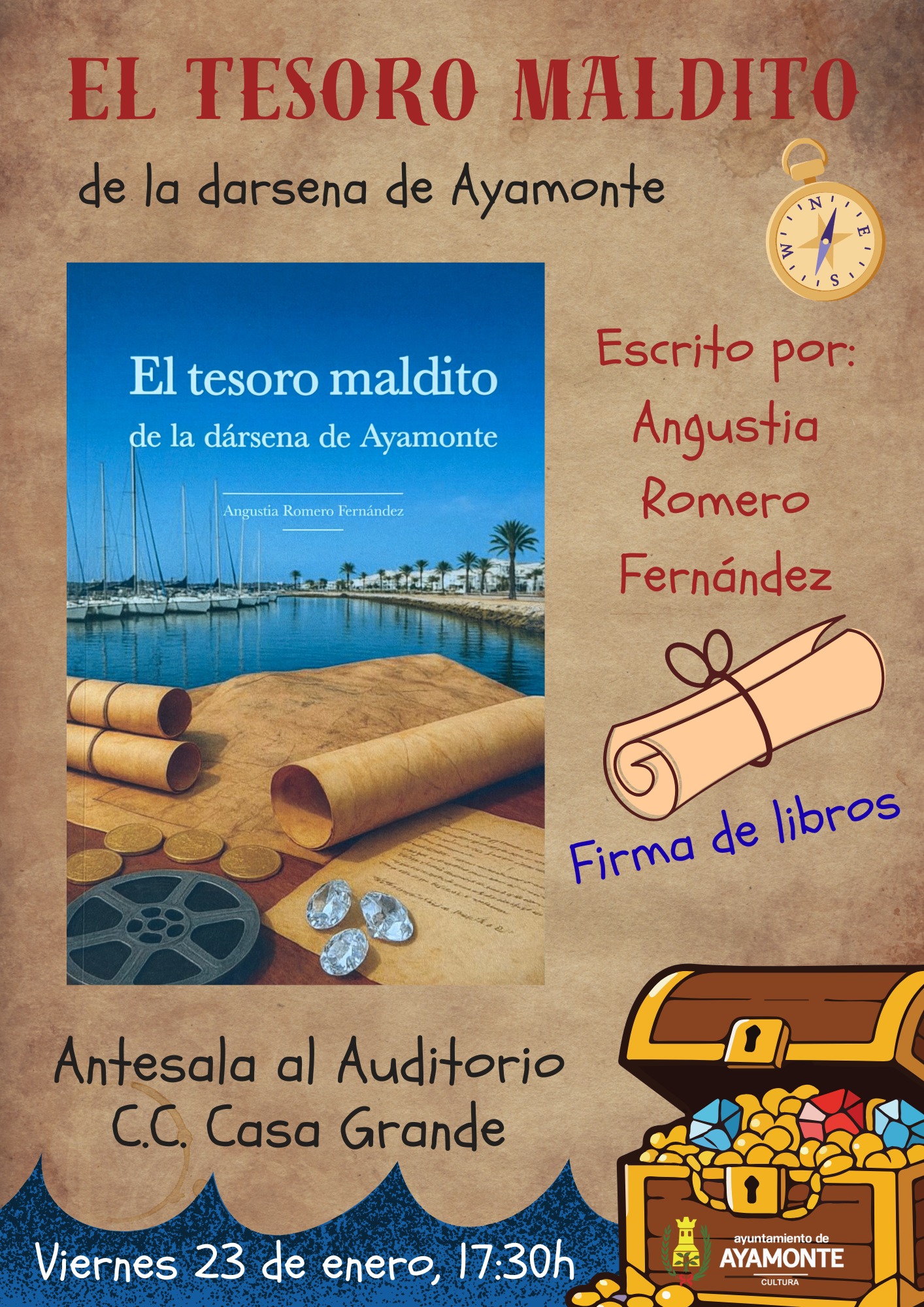 FIRMA DE LIBROS EL TESORO MALDITO DE LA DÁRSENA DE AYAMONTE. ANGUSTIA ROMERO FERNÁNDEZ + Añadir Google Calendar Exportación + iCal / Outlook El evento está terminado. Fecha Ene 23 2026 Finalizdo! Hora 5:30 pm - 7:00 pm Localización Casa Grande C. Huelva, 37, 21400 Ayamonte, Huelva Web https://www.juntadeandalucia.es/cultura/agendaculturaldeandalucia/evento/la-casa-grande-ayamonte Teléfono 959 32 18 71 Compartir este evento