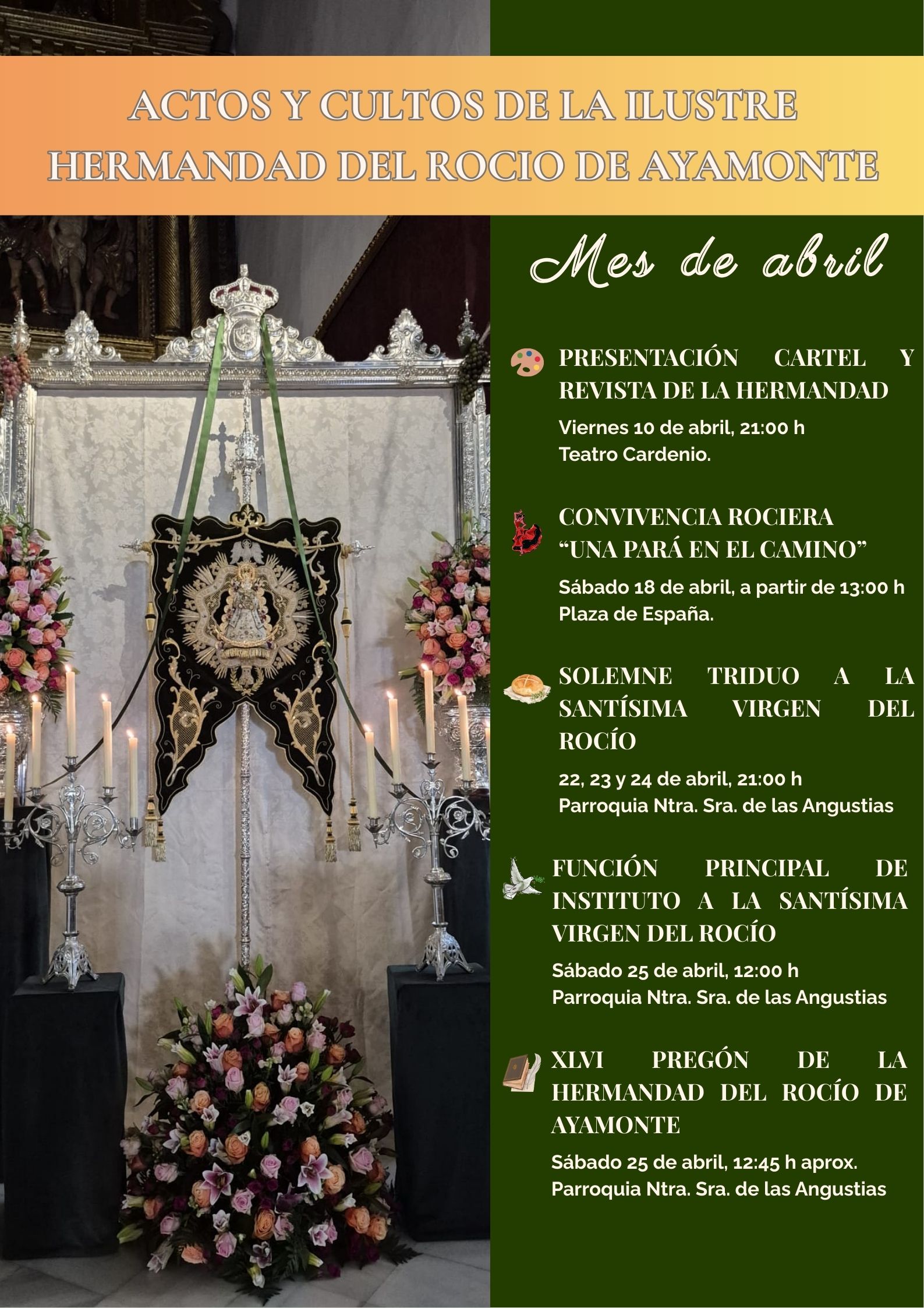 FUNCIÓN PRINCIPAL STMA. VIRGEN DEL ROCÍO Y XLVI PREGÓN DE LA HERMANDAD DEL ROCÍO DE AYAMONTE + Añadir Google Calendar Exportación + iCal / Outlook 00 días 00 horas 00 minutos 00 segundos Fecha Abr 25 2026 Hora 12:00 pm - 2:00 pm Localización PARROQUIA DE LAS ANGUSTIAS CALLE ANGUSTIAS 8, AYAMONTE Compartir este evento