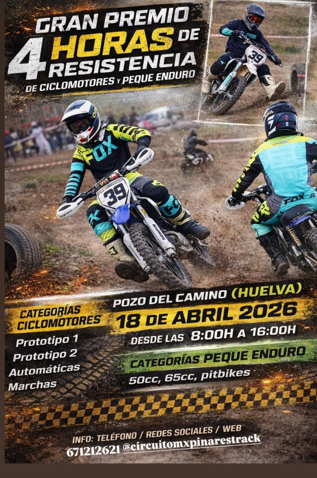 GRAN PREMIO ENDURO POZO DEL CAMINO + Añadir Google Calendar Exportación + iCal / Outlook 00 días 00 horas 00 minutos 00 segundos Fecha Abr 18 2026 Hora 8:00 am - 4:00 pm Localización POZO DEL CAMINO POZO DEL CAMINO, HUELVA Compartir este evento