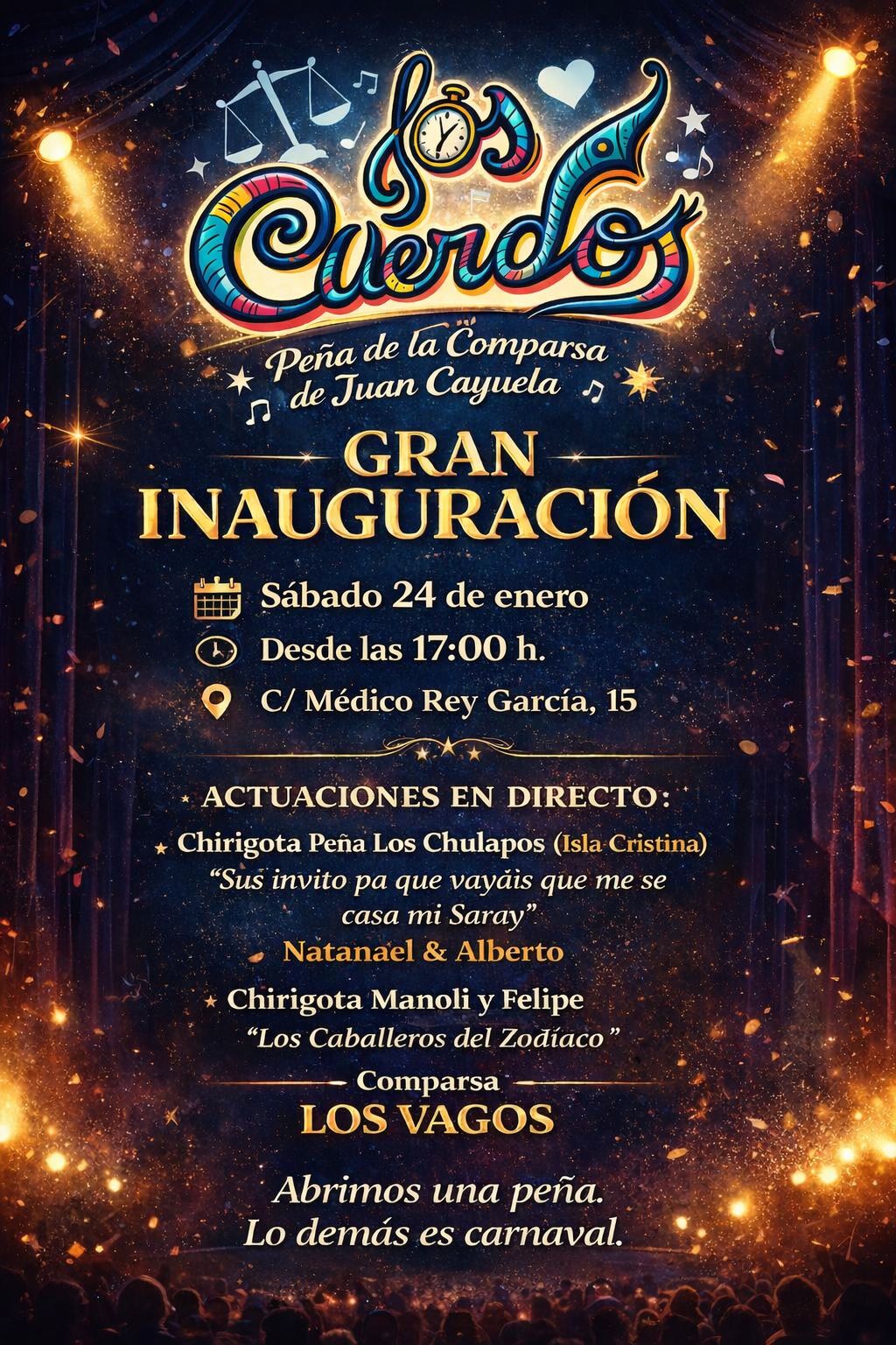 INAGURACIÓN PEÑA DE LA COMPARSA DE JUAN CAYUELA + Añadir Google Calendar Exportación + iCal / Outlook 00 días 00 horas 00 minutos 00 segundos Fecha Ene 24 2026 Hora 5:00 pm - 8:00 pm Compartir este evento