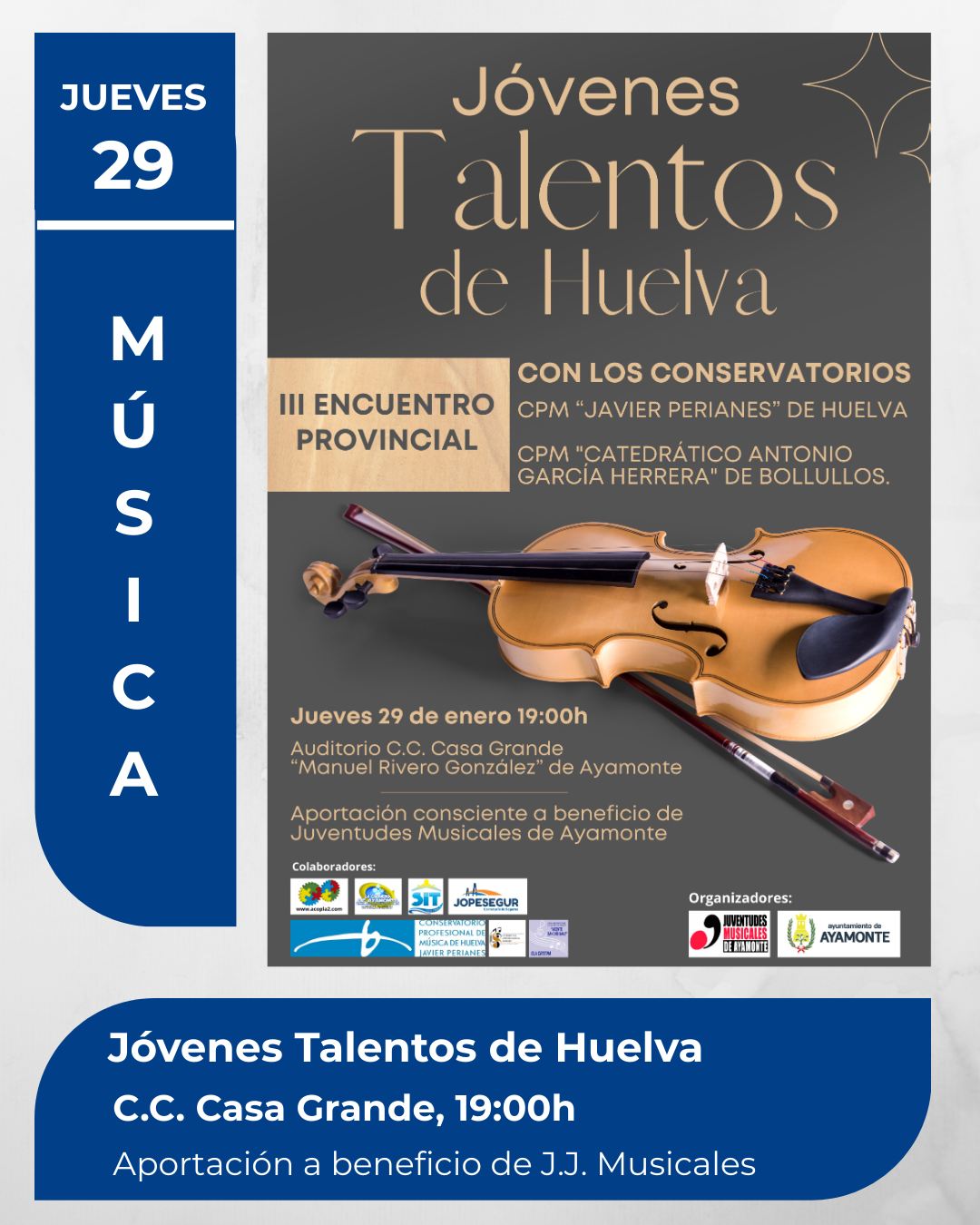 JÓVENES TALENTOS DE HUELVA + Añadir Google Calendar Exportación + iCal / Outlook 00 días 00 horas 00 minutos 00 segundos Fecha Ene 29 2026 Hora 7:00 pm - 9:00 pm Localización Casa Grande C. Huelva, 37, 21400 Ayamonte, Huelva Web https://www.juntadeandalucia.es/cultura/agendaculturaldeandalucia/evento/la-casa-grande-ayamonte Teléfono 959 32 18 71 Compartir este evento