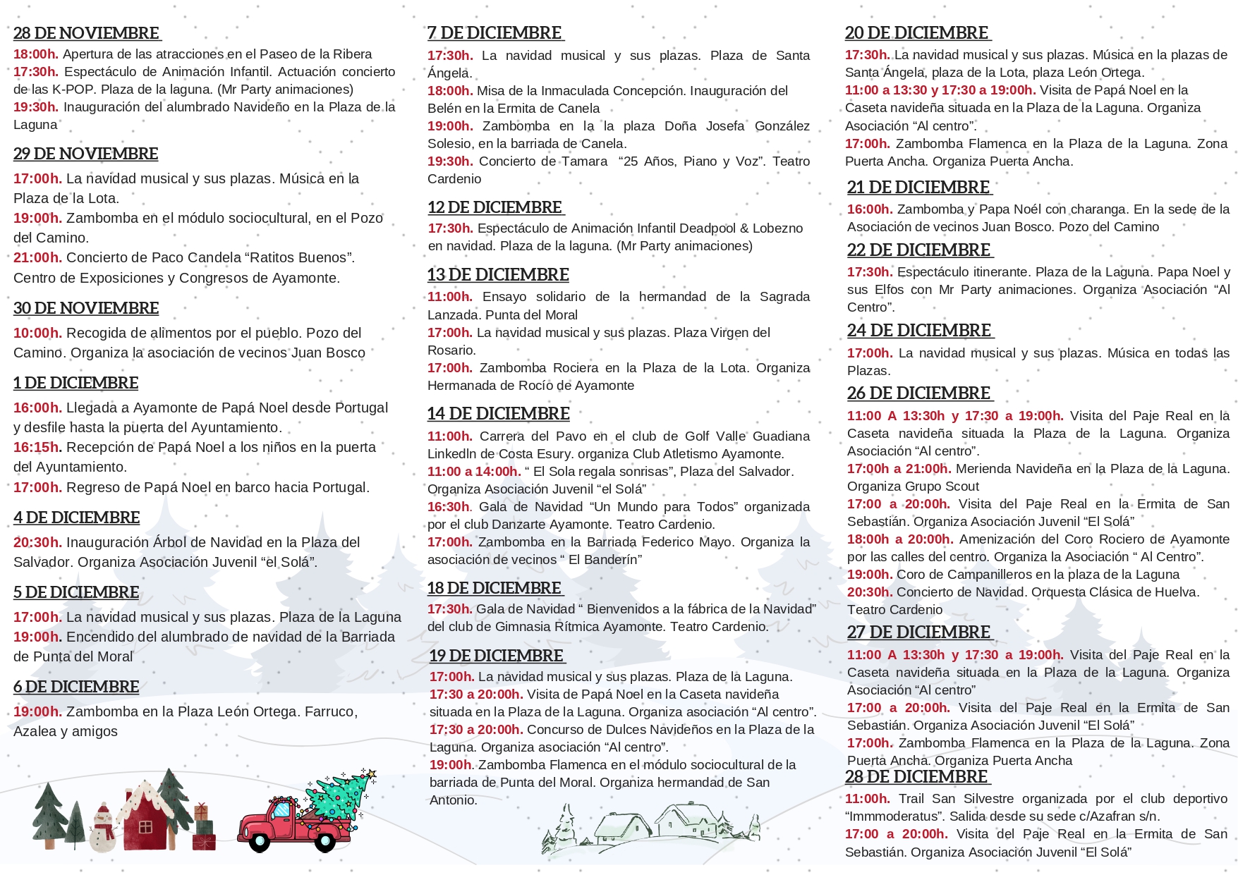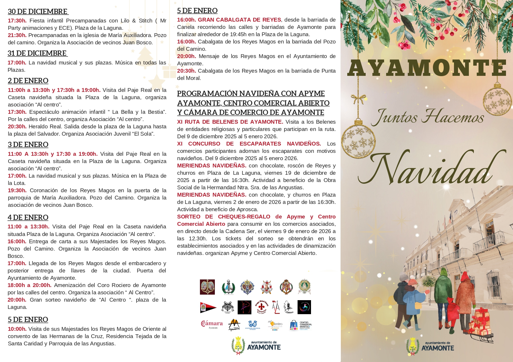PROGRAMACIÓN NAVIDAD 2025 + Añadir Google Calendar Exportación + iCal / Outlook 00 días 00 horas 00 minutos 00 segundos Fecha Nov 28 2025 - Ene 05 2026 Hora 8:00 pm - 10:00 pm Localización AYAMONTE AYAMONTE, HUELVA Compartir este evento