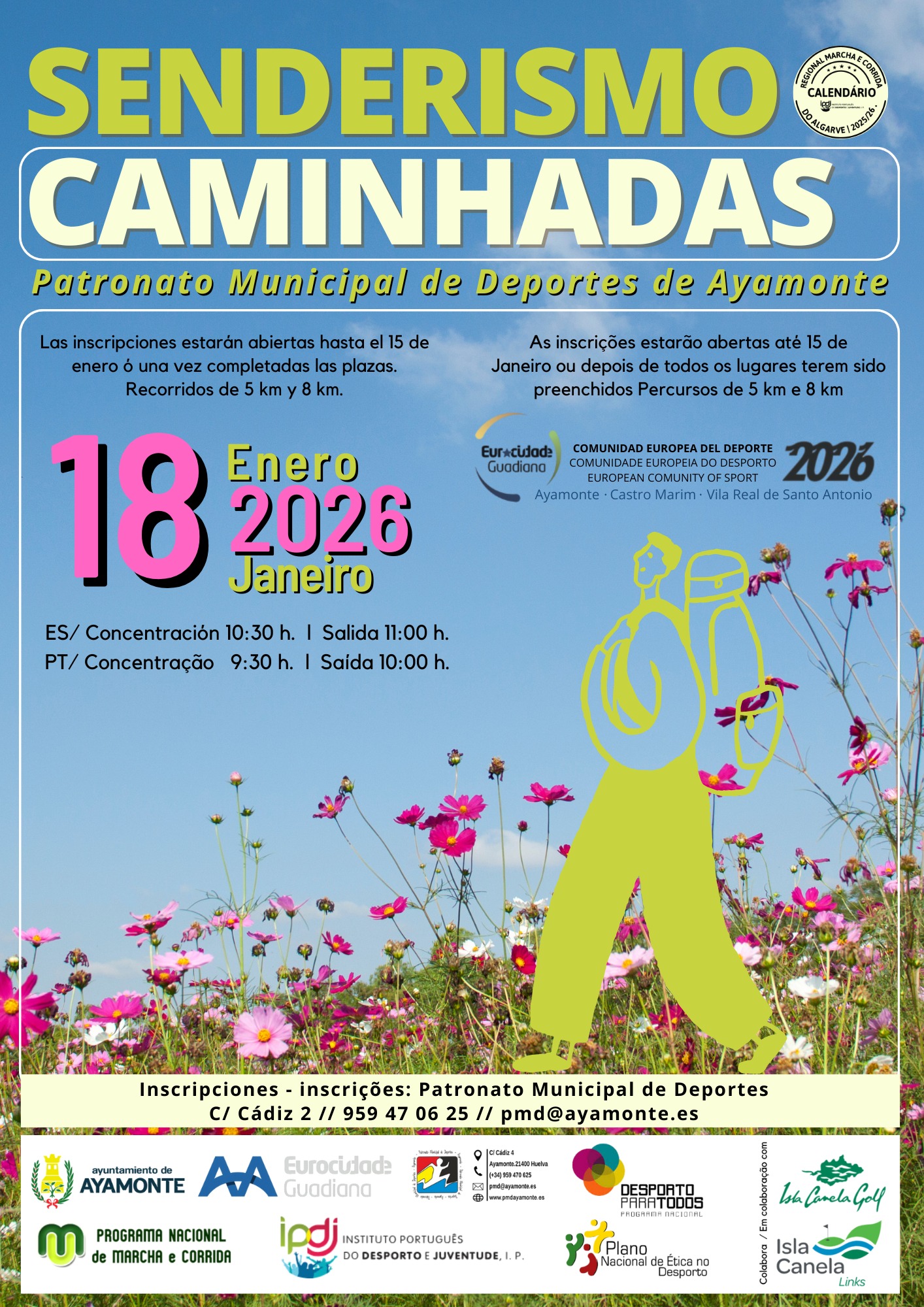 SENDERISMO CAMINHADAS + Añadir Google Calendar Exportación + iCal / Outlook 00 días 00 horas 00 minutos 00 segundos Fecha Ene 18 2026 Hora 11:00 am - 1:00 pm Localización PABELLÓN MUNICIPAL DE DEPORTES CALLE CÁDIZ 4, AYAMONTE Compartir este evento