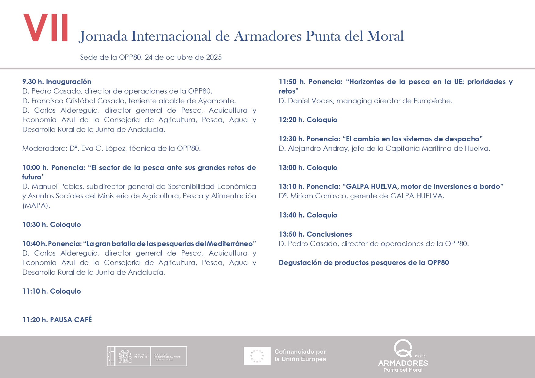 VII JORNADA INTERNACIONAL DE ARMADORES PUNTA DEL MORAL + Añadir Google Calendar Exportación + iCal / Outlook El evento está terminado. Fecha Oct 24 2025 Finalizdo! Hora 9:30 am - 1:50 pm Localización PUNTA DEL MORAL PUNTA DEL MORAL, HUELVA Compartir este evento